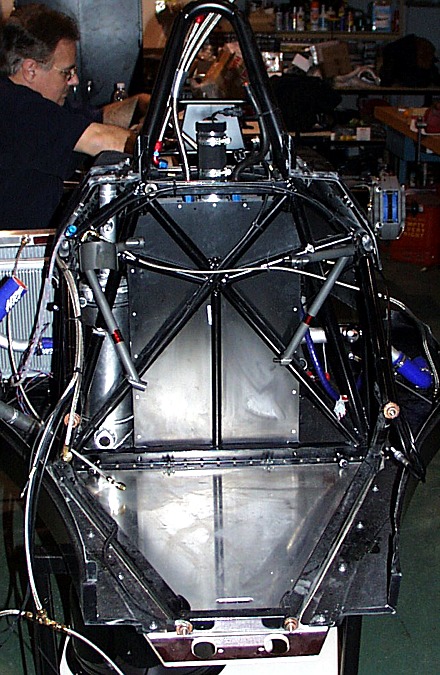 Here we're looking at the empty engine bay. There are a two things you should do right now. 1) Remove the left and right upper motor mounts. 2) Position any wiring running on the bulkhead tubes to be as close to the fuel cell skin as possible (i.e. rotate the starter power wire off the face of the lower left bulkhead tube. Also notice Robert installing the data acquisition system on the cockpit floor.