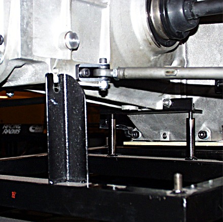 STEP 2: Remove the Transaxle OK, now it's time to pull the transaxle off the end of the chassis. You'll see that one of the key concepts in making for a painless engine installation is the creation of a transaxle cart. This cart has a basic height that mates up with your car cart...and the transaxle cart has height adjusters that let you raise, lower and tilt the transaxle to align it to the car and engine. I'll be posting more detailed instructions on how to make this cart at a future time. Big thanks go out to John Church at JDC Motorsports for the design concept.