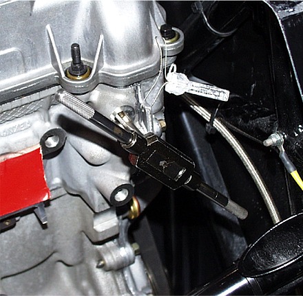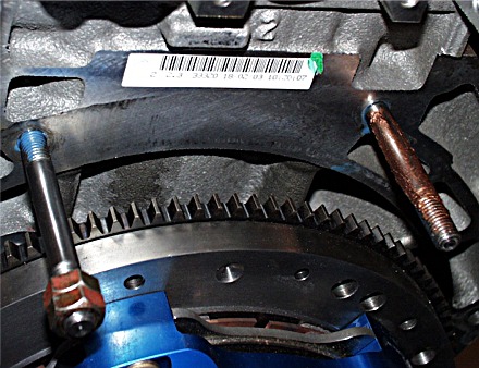 Install the transaxle-to-engine and transaxle-to-chassis bolts as you can and gently draw up the transaxle to the engine. Then it's time to install the left and right front motor mounts. Note that you should have the LF mount loosely attached to the oil pump plate at this time. We found that loosely installing the LF motor mount (install the 2 engine bolts first, and then the frame bolt) and then installing the RF motor mount (also install the 2 engine bolts first).