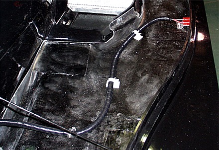 One of the smarter things we did was to put in a remote booster/charger jumper system for the battery. Here you see the cables lying on the floor and leading to an "Anderson" plug on the right side of the picture. We used this jumper a LOT. Even though we're running an alternator with the smaller pulley, we found that it was very important to keep the charge up on the battery.