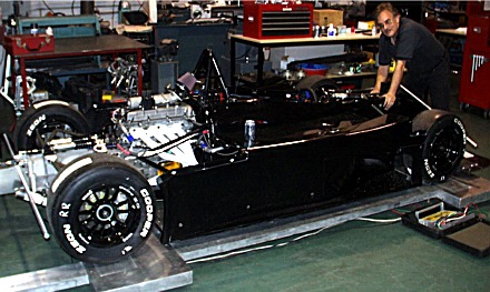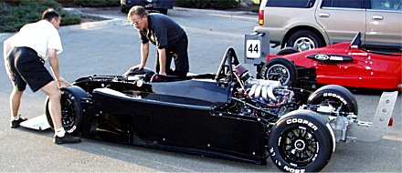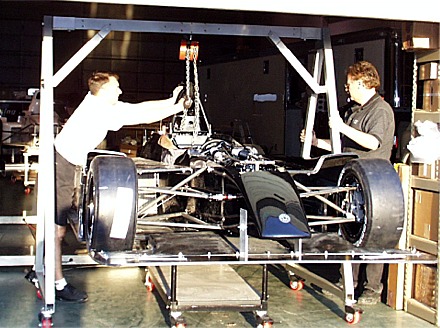 Here you see John Church (on the left) and Robert lowering the car off its shop cart. FWIW, the 24" high shop cart may be perfect for a formula car, but it's too high for a sports racer (you can't reach into the cockpit with the car on the stand and the bodywork on). After the Atlanta race, I lowered the cart (and transaxle cart) to an 18" height...works well.