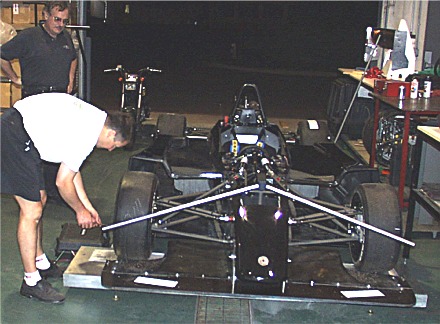Here you can see John Church helping us set the toe while Robert supervises. You can also see the toe bars we got from Comprent Motorsports. They work well. One other thing--this is the first time we've used cloth fishing line (for catching "Muskies") and the elasticity of that line really makes setting up the toe strings easy. Also note that it's now dark...the night before the car has to leave for Atlanta. But we made it and the car ran great! |